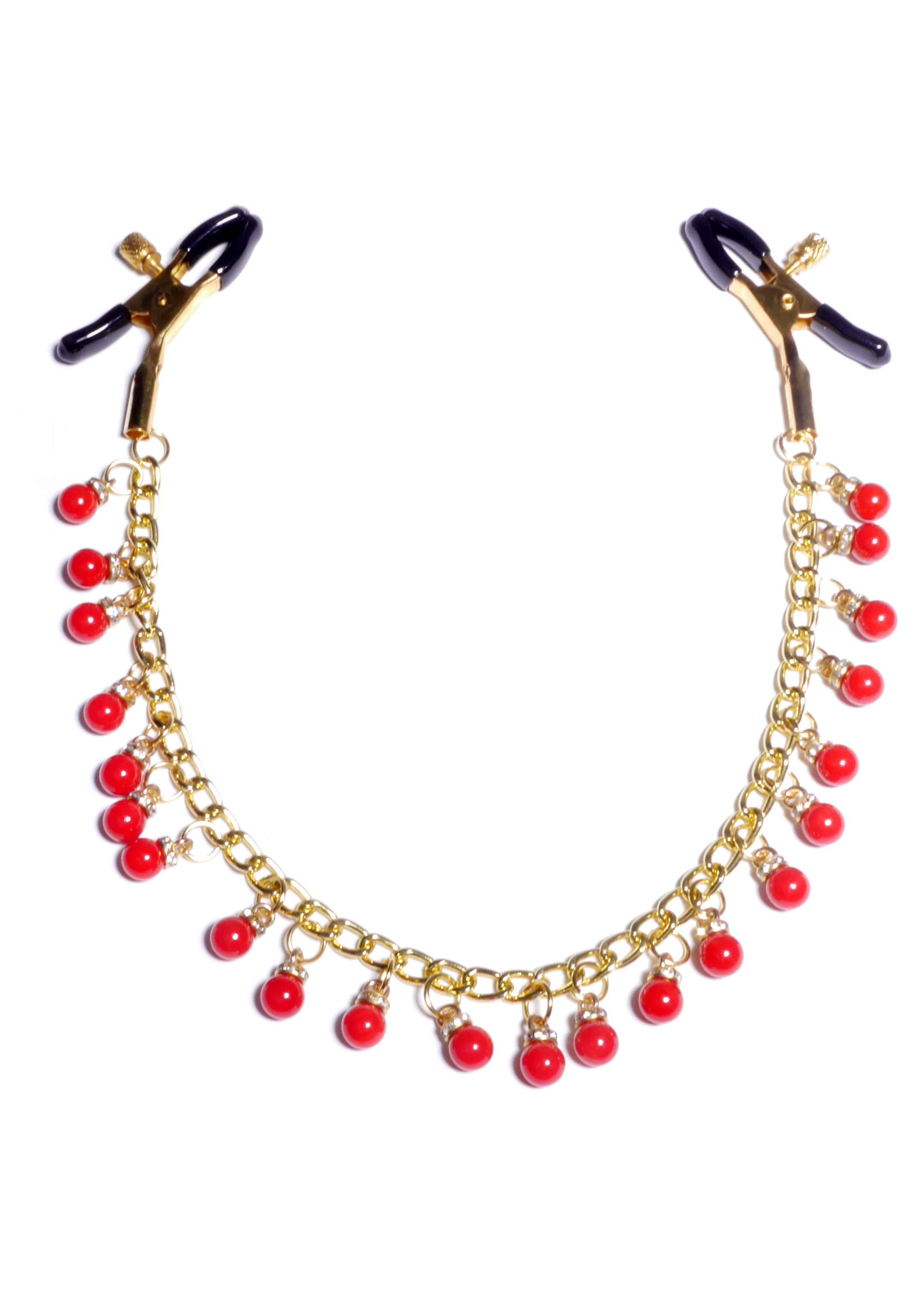 Міцні металеві затискачі, покриті м'якою гумою, ці затискачі ідеально підходять для новачків і ентузіастів. Силу затиску соски можна регулювати обертанням гвинта.Елегантний ланцюжок з дрібними прикрасами з'єднує обидва соски, створюючи неймовірну стимуляцію при кожному русі. Вага: 27 г. Загальна довжина 40 см.